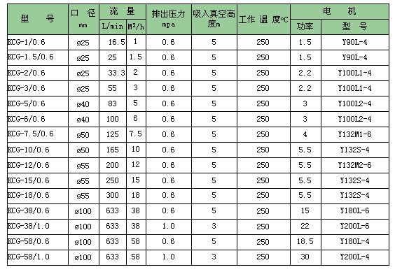 KCG高溫齒輪油泵●用途 塑料橡膠加工工業(yè),紡織印染工業(yè),涂料工業(yè),木材加工工業(yè),食品業(yè)、造紙印刷等液態(tài)熱載體加熱載體加熱傳輸?shù)雀鞣N工業(yè)。 ●應用范圍 KCG高溫齒輪油泵適用于輸送不含固體顆粒和纖維,無腐蝕性的高溫液體,介質溫度可達250℃,粘度為5-1500cst。 ●結構型式 本系列的齒輪泵由齒輪、軸、泵體泵蓋、軸端密封等零部件組成,所有零件均選用合適的耐溫材料制造。泵內運轉零件均利用其輸送的介質潤滑。 KCG型泵配有安全閥,可防止超載對泵和電機造成損壞。 常用KCG高溫齒輪油泵性能參數(shù)表